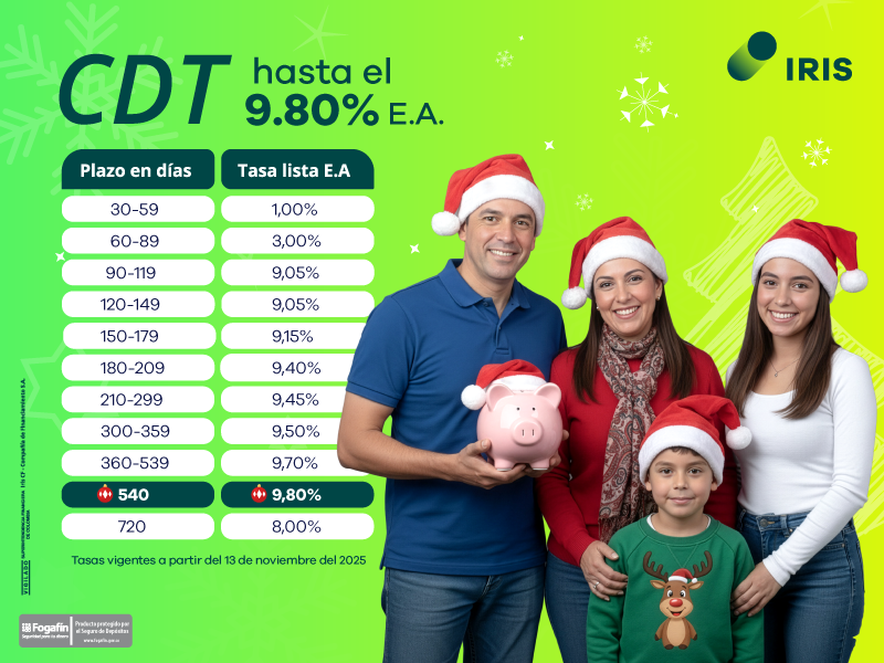 Abre tu CDT con Iris y descubre que aquí tu dinero no se queda quieto, se proyecta, se cuida y crece contigo. ¡Es cercano, es simple, es claro!